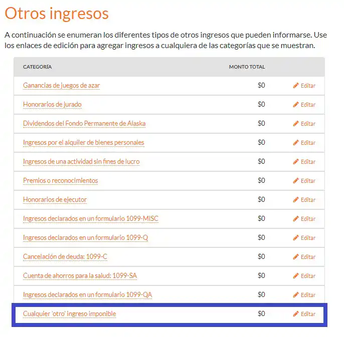 Seleccione "Editar" junto a "Cualquier otro ingreso imponible".