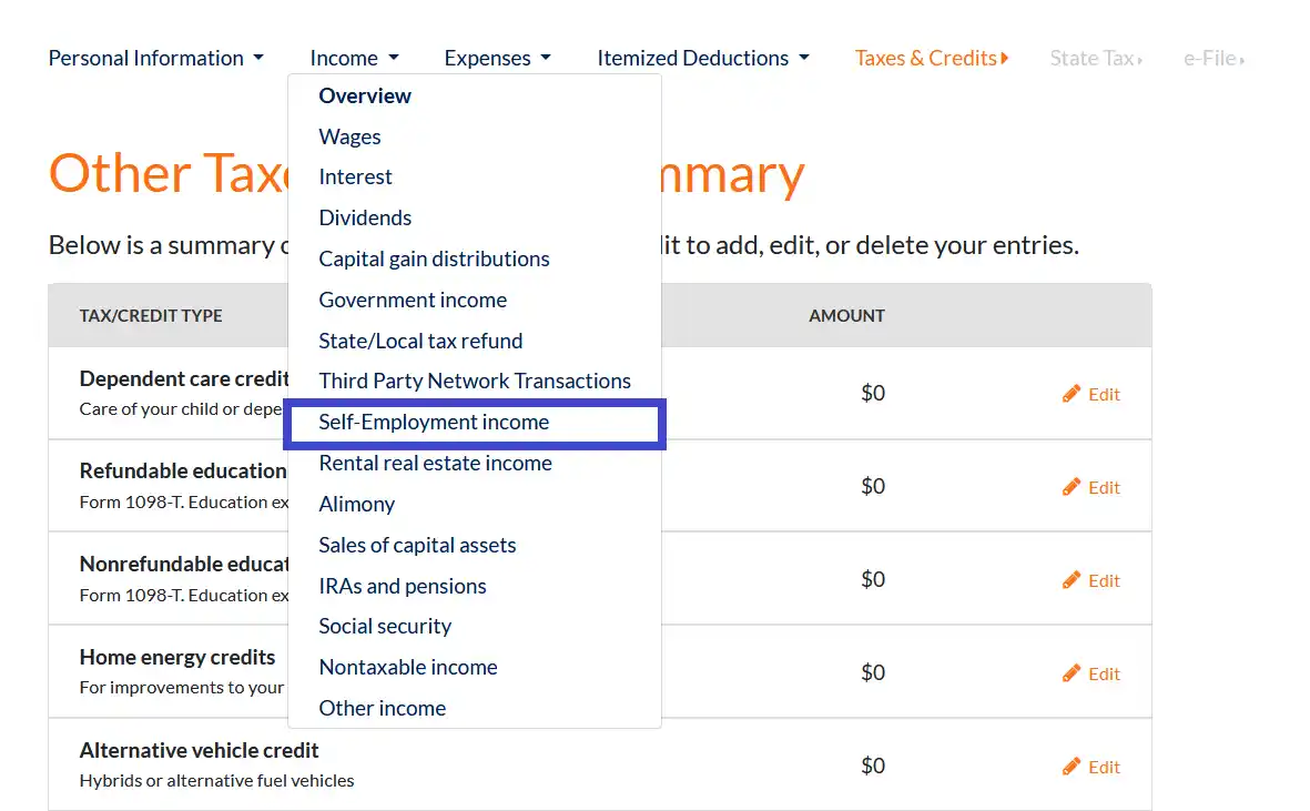 If you are on the "Income Summary" screen, click on the "Edit" link on the "Self-Employment Income" line to add, edit, or delete a self-employment income (1099-NEC) entry.