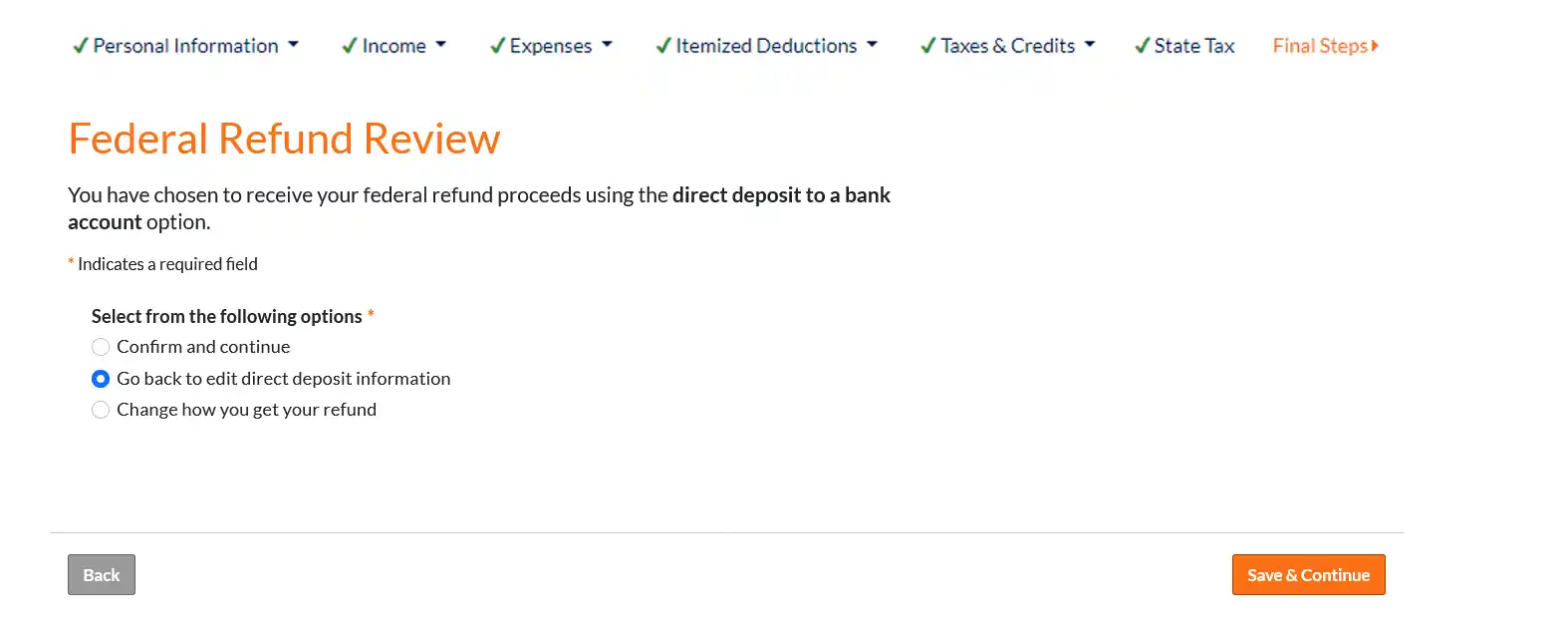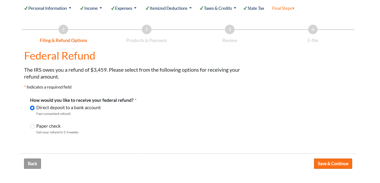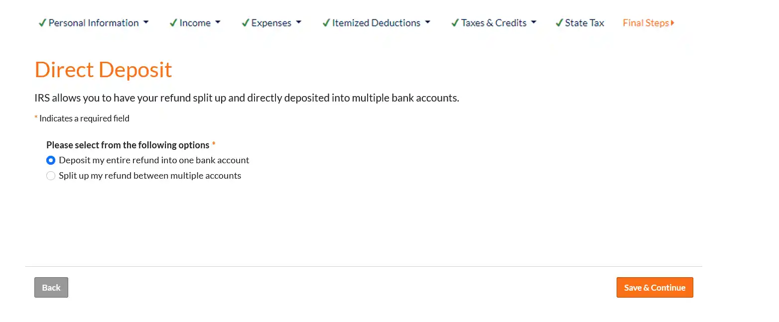 On the "Federal Refund" screen, select "Direct deposit to a bank account" and click "Continue."