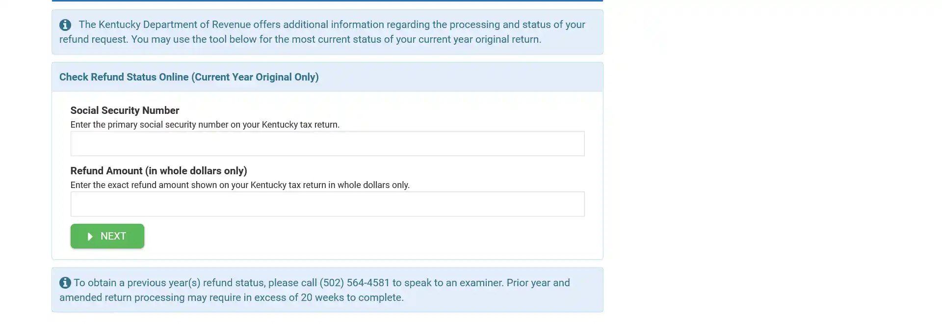 Note: If you want to check the refund status for a previous year’s return, you must call (502) 564-4581 to speak to an examiner.