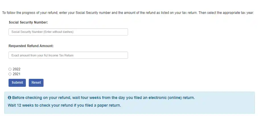 You can check the status of your New Jersey refund 4 weeks after you’ve e-filed. If you paper filed, the processing time is 12 weeks. Please note, manual processing of returns takes longer.