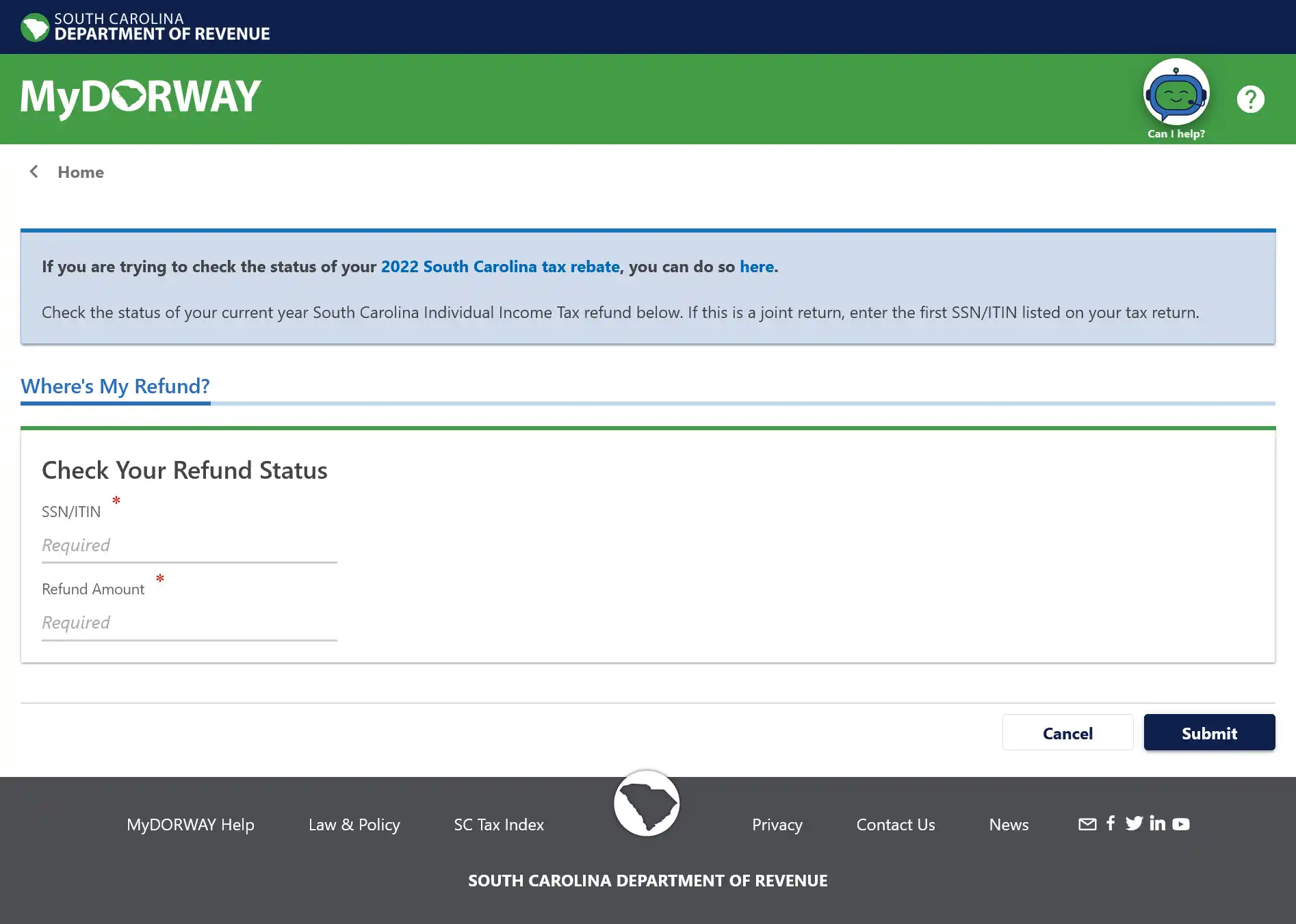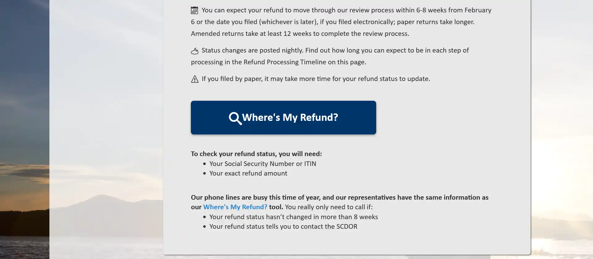 You can check the status of your South Carolina tax refund using the “Where’s My Refund?” tool. Scroll down until you see “Where’s My Refund?” button and click it to continue.